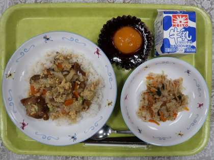 牛乳、あぶらふ丼(宮城の郷土料理)、キャベツのあっさりあえ、お月見ゼリー