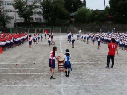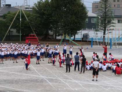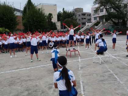 全校練習の2回目は、応援合戦です。運動の競い合う楽しさと応援して支える楽しさ、お互いを称える素晴らしさ、そして、みんなで盛り上がる楽しさが応援合戦にはあります。応援団長を中心に応援団が、きびきびとした動きと大きな声でみんなを盛り上げました。全校児童の大きな声が校庭に響きました。近隣の皆様には、ご迷惑をおかけしていること心よりお詫び申し上げます。