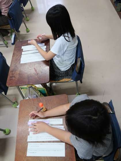 2年生は、国語科で「どうぶつ園のじゅうい」という説明的文章を学習しています。時間を表す言葉に着目して6枚の文章の順番を考えています。謎を解くような学習で子供たちは、言葉を証拠にして順番を発表していました。