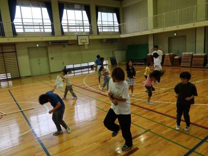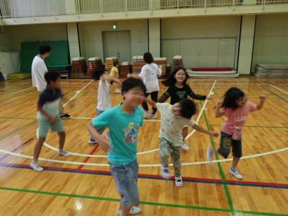 5組さんは、いよいよ明日から宿泊学習で軽井沢に行きます。体育館でキャンプファイヤーの練習をしていました。心を開放してダンスやゲームをしています。みんなで盛り上がり、心に残る宿泊学習になりそうです。