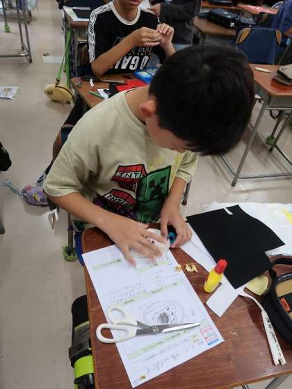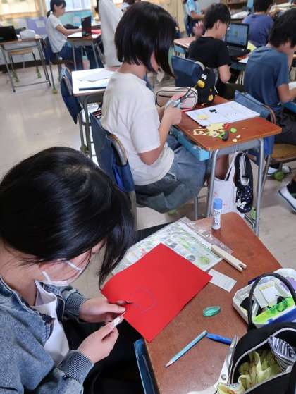 5年生が、家庭科でフエルト素材を使って小物づくりをしていました。どうやら移動教室のバックに付けて自分の目印となる小物のようです。学習した縫い方を生かして思い思いの作品を作っています。自分のお気に入りの小物ができそうです。