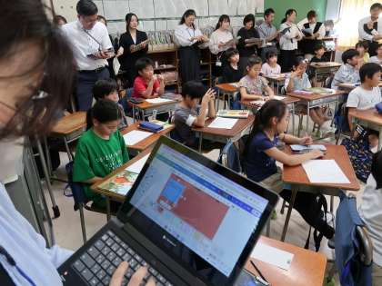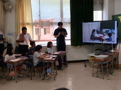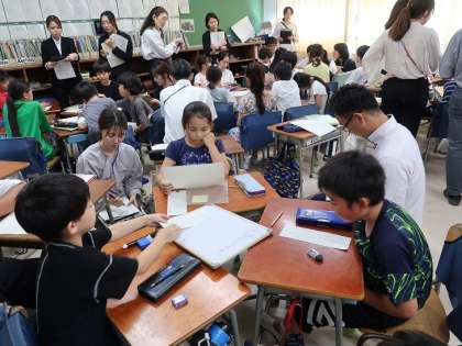 3年生が、国語科の授業研究を行いました。話し合いマイスターをめざして、1年生に紹介する本を話し合いで選んでいます。自分の紹介したい本と友達の選んだ本を1年生の立場になって観点を整理してよりよい本を選んでいます。子供たちの主体的で協働的な学びをどのような授業にすることで実現できるのかを検証しています。先生方は、タブレットに気が付いたことをなどを記録してその場で全員の記録が集約されていきます。