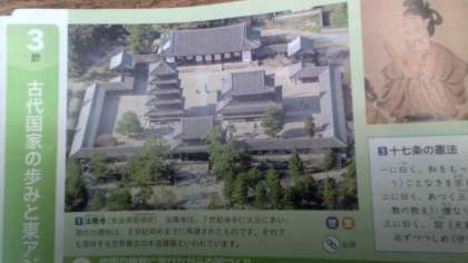 教科書に奈良、法隆寺の写真がありました。3年生が先週見学したばかりです。