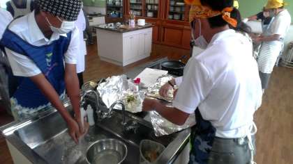 調理実習「サケのホイル焼き」です。テンション高く、ワイワイと活動しています。