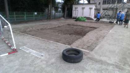 主事さんが砂場を整地してくれています。この度、体育用の砂を入れますので、その準備です。