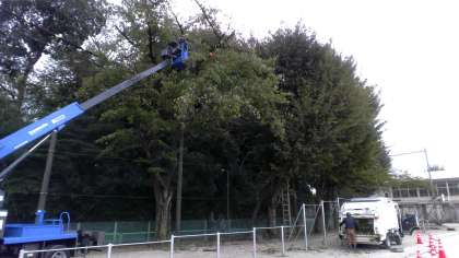 同じ校庭では、植木屋さんが、高所作業車を使って校庭の桜を剪定してくれています。台風などで木が倒れたり折れたりしないよう、うまく切ってくれるそうです。