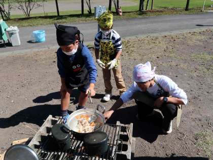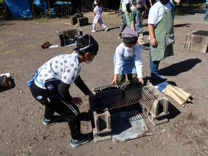 はじめに豚肉を炒め、次に野菜も入れてよく炒めました。かまどの火を調節している火の係の頑張りどころです。ルーを入れたらよーく煮込みました。できたカレーはとってもおいしかったです。かまどの残り火には、サツマイモを入れて焼き芋を作りました。
