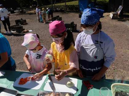 いよいよ昼食づくりの飯盒炊飯・カレー作りです。初めにベルデの方から説明を聞き、みんなで協力して準備です。ブロックでかまどを作り、お米をとぎ具材を切りました。みんなでおいしく作るぞー!