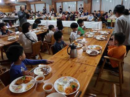 お待ちかねの夕食の時間です。初めに4校のお友だちが一堂に会したので学校紹介をしてから「いただきます」をしました。