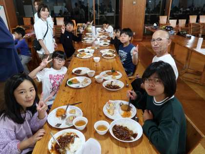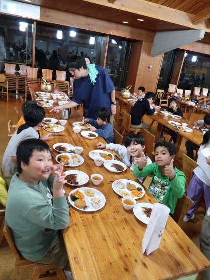 画像は、二日目の夕食風景です。いっぱい活動してきたので、明日も元気に活動できるようにモリモリ食べています。ハンバーグにコーンクリームコロッケなど、好きなメニューかな?豚汁は、具沢山で温かく心にしみました。
