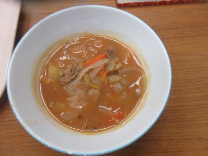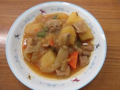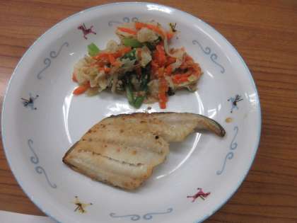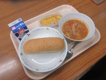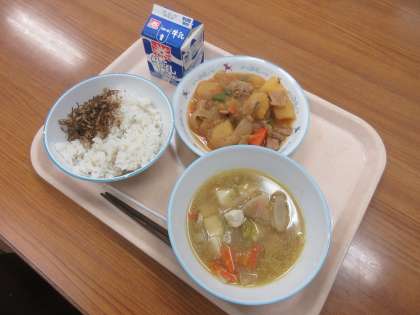 麦ごはん、小魚のふりかけ、韓国風肉じゃが、根菜のごま汁、牛乳 韓国風肉じゃがということで、どのように違うのかなと思いながらいただきました。やはり一般的な肉じゃがと味、風味が違いました。栄養士さんに聞くとコチジャンが入っているとのこと。なるほどと思いましたが、辛くはありませんでした。ご飯の上にのせて食べたいところでしたが、今日はふりかけがのっていたのでやめました。私はごはんとふりかけをよく混ぜていただく派です。ご飯をいただきながら、箸にはさんだ豚肉と玉ねぎをいただきます。甘辛く、独特の風味がしてきます。根菜ごま汁は、大根、ニンジン、レンコン、ゴボウ、豆腐が入っていて、すりおろしたゴマの香りがホンノリただよいます。味もみそだけとは違い香ばしさを感じます。こちらもおいしいです。何気ないひと手間がおいしさをさらに倍増してくれています。