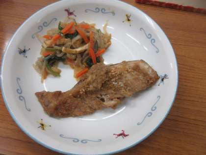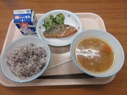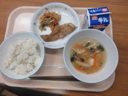 麦ごはん、鰆のごまみそ焼き、ぴりぴりしらたき、沢煮椀、牛乳 ごはんに、鰆を乗せていただきます。ごまみその香りがして、ごはんによく合います。ぴりぴりしらたきという名前ですが、ぴりぴりではありません。どちらかというとお浸しのようで、ニンジン、油揚げ、青菜がおいしいです。沢煮椀は具沢山の煮ものとのことですが、スープです。こちらもニンジン、青菜、大根、エノキが入っていて、おすましのようで、ごはんにはピッタリでした。鰆は春を告げる魚ですが、秋に食べてもおいしいです。