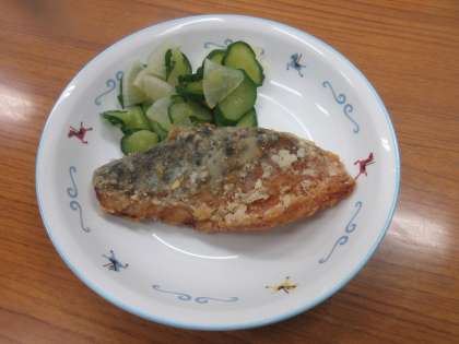 ゆかりごはん、サバの竜田揚げ、もみうり、うすくず汁、牛乳 竜田揚げの名前の由来については諸説ありますが、有力な説の一つとして奈良県の竜田川にちなんで名付けられたというものがあります。小倉百人一首にも収録されている在原業平の和歌「千早ぶる神代も聞かず竜田川からくれなゐに水くくるとは」に由来するという説です。この和歌に登場する奈良県の竜田川は、古くから紅葉の名所として知られていて、竜田揚げの揚げた後の色が赤褐色をしており、紅葉のように見えることから命名されたとする説です。 両面をあぶり千切りにした薄揚げを加えた「もみうり」は奈良の夏の定番の家庭料理です。夏野菜であるきゅうりを使用することから夏に食べられることが多く、田植えが終わり、秋の豊作を祝う行事である早苗饗(さなぶり)の行事にも食されているそうです。