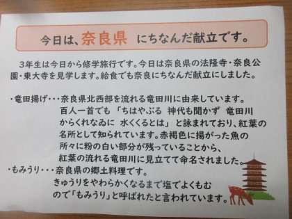 ↓ 令和7年度 修学旅行 10月7日(火) 本日の給食