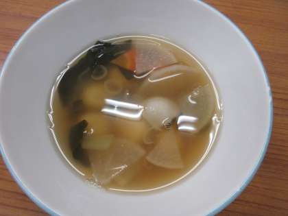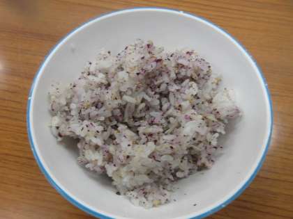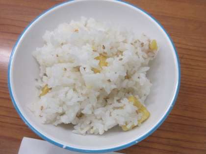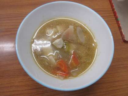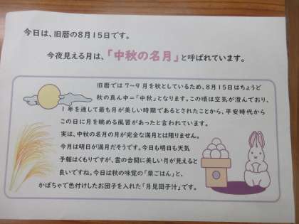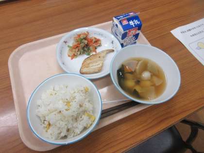 栗ごはん、ホッケのみりん焼き、野菜のごま和え、月見団子汁、牛乳 1年ぶりの栗ごはんです。栗と白ごまが入っていて、塩が少し効いています。その塩が栗の甘さをより引き立てて美味しいです。生徒の中には栗がイヤだということで分けてしまう人がいるようですが、栗も松茸やサンマと並んで段々高級になっています。秋を代表する味覚“栗”、無駄にならないように食べていきたいものです。