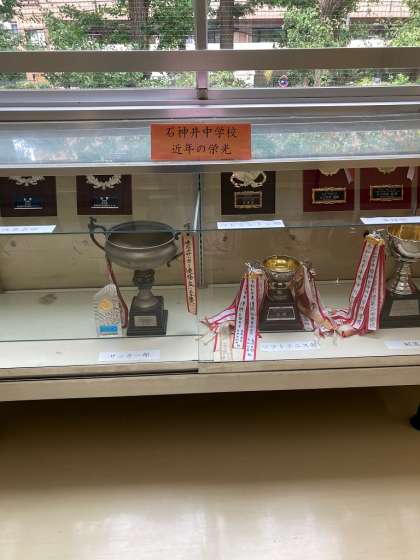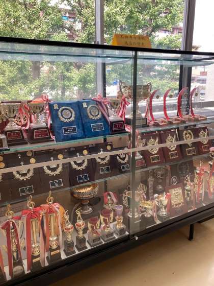 校舎2階職員室前には部活動などで表彰され、いただいた盾やトロフィーが飾られています。