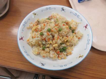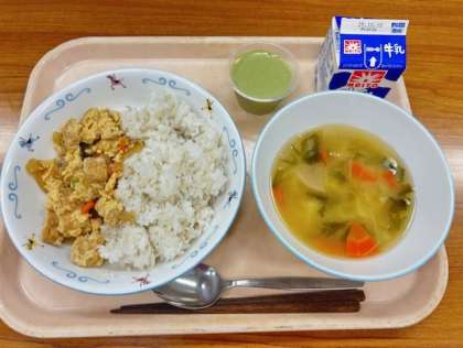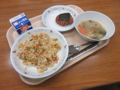 五目チャーハン、のりあげくん、関東スープ、牛乳 五目チャーハンにはチャーシュー、たまご、グリンピース、ニンジン、シイタケなどが入っていて、ボリューム満点、とても美味しいです。広東スープは白湯スープに白菜、チンゲン菜、タケノコなどの野菜が入ってこちらも美味しいです。でも一番おいしかったのはのりあげくん、鶏ひき肉に野菜が入っていて両面にのりを貼って揚げてあります。サクッとした食感に中身のトロッとした食感がたまりません。今日の給食はいつも以上に手が込んでいて、その分、いつも以上に美味しかったです。お腹いっぱい食べました。ごちそうさまでした。