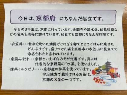 衣笠丼、京風みそ汁、抹茶ミルクゼリー、牛乳 3年生が修学旅行で京都に行っているので、1・2年生も 京都にちなんだ料理の給食です。 今日は特に抹茶ミルクゼリーの評判が良かったです。 生徒たちの活躍
