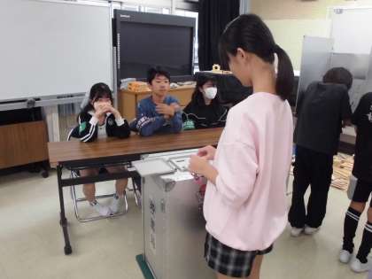 後半は、いよいよ模擬投票です。自分で考えて投票先を決めます。そして、選挙の決まりに則って投票をしました。投票者の一人目が、立会人と一緒に、投票箱の中が空のことを確認するとか、知りませんでしたね。これは空虚確認や零票確認と呼ばれているそうです。あとに続く子たちも、みんな必要以上の会話はせず、淡々と選挙に参加していました。政治の在り方を決めるのは私たち有権者です。この権利は、軽いものではありません。ぜひ、選挙権をもったら、その権利を無駄にせず、自分の意思を示していきましょう。