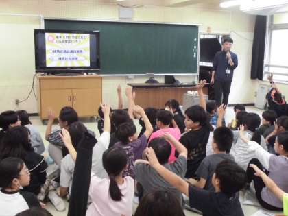 2時間目の始まりは避難訓練でした。緊急地震速報からの避難想定でした。雨天のため教室内での安全確認となりましたが、どの学級も落ち着いて対応できていました。報告終了後に、校長先生から、本日の防災訓練でご協力いただく避難拠点の皆様・区防災課の皆様・貫井出張所の皆様を紹介していただき、それぞれご挨拶をいただきました。このあと、総合防災訓練が行われました。