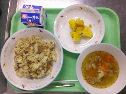 ・麦ご飯 ・牛乳 ・鶏肉の香味焼き ・切り干し大根の炒め煮 ・生揚げの味噌汁 今朝はとても冷え込み、秋本番、という感じになってきましたね。昨日から始まった合唱練習の歌声も冷たい空気に乗ってよく響いています。今日は鶏肉の香味焼きが味噌味のソースと絶妙な味付けで美味しくいただきました。ご馳走様でした。 ![]() ![]() 10月14日(火)の給食![]() ![]() ・焼き肉ガーリックライス ・バジルビーンズポテト ・野菜スープ ・牛乳 焼き肉ガーリックライスは、野菜と豚肉を炒めて調味し、ご飯に混ぜ合わせたものです。野菜はにんじんとタマネギ、それからゴボウも入っています。野菜はみじん切りにしているため、食べやすくなっています。 バジルビーンズポテトは、茹でた大豆と、じゃがいもを素揚げし、油切りをした後に、バジルと塩を合わせて振りかけたものです。 10月10日(金)の給食