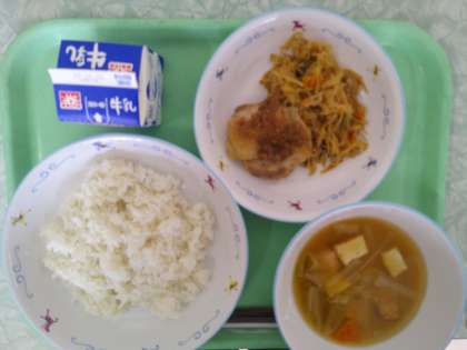 ・スパゲティ・ミートソース ・牛乳 ・コールスローサラダ ・果物(梨) 今日も涼しく、秋の空気でした。テストも終わり、生徒たちは元気いっぱいです。ボリュームたっぷり人気のミートソーススパゲティは、おかわりをする生徒がたくさんいましたね。さっぱりしたコールスローサラダとのバランスが絶妙でした。秋の味覚の梨も、甘くて美味しかったです。ご馳走様でした。 ![]() ![]() 10月2日(木)の給食![]() ![]() ・韓国風焼肉丼 ・わかめサラダ ・ココアゼリー ・牛乳 丼の豚肉は、甘辛味噌で下味をつけてから炒めています。コチュジャンは、辛くなりすぎないように量は調節しています。野菜もたっぷり入った丼です。 サラダにトッピングされているものは、チーズです。すりおろしたタマネギを使った手作りドレッシングで調味しています。 10月1日(水)の給食![]() ![]() ・ビーンズドライカレー ・ブロッコリーのサラダ ・カフェオレゼリー ・牛乳 今日のカレーの豆は、レンズ豆を使用しています。レンズ豆は下茹での必要がなく、そのまま使えます。十分に水洗いをしてから使用しています。ご飯は、カレー粉を加えて炊飯したので、ご飯が黄色くなっています。 ゼリーはアガーを使っていますので、とてもプルプルしています。 9月30日(火)の給食![]() ![]() ・麦ご飯 ・油淋鶏(ユーリンチー) ・わかめサラダ(大根) ・にらと卵のスープ ・牛乳 今日は人気献立のユーリンチーです。学校給食では、加熱調理が基本なので、ドレッシングやたれも加熱しています。ユーリンチーのたれには、お酢を使っていますが、加熱をしているので酸味が和らいでいます。 修学旅行 3日目