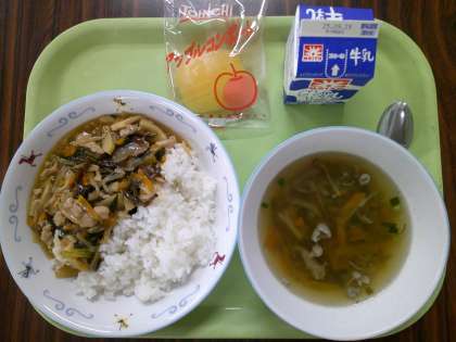 牛乳 豚肉と小松菜のあんかけ丼 茎わかめ入り根菜汁 果物(冷凍アップル) 「りんご」は運動前に食べると良いされている果物です。消化が良く、運動前に食べても胃に負担をかけにくい特徴があります。エネルギー源としても即効性があり、持久力がアップするそうです。みずみずしい「りんご」は、水分補給の役割もします。 季節は少しずつ秋に向かっているようです。今年度、最後の「冷凍アップル」です。 今日もおいしくいただきましょう! 今日の給食【9月19日】
