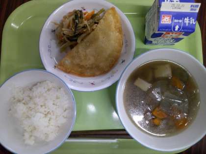 牛乳 ごはん 豆腐とツナの揚げ餃子 こんにゃくあえ 田舎汁 「こんにゃく」を使ってあえ物を作りました。「こんにゃく」は、里芋の仲間の「こんにゃくいも」からつくります。食物せんいが豊富で、おなかのそうじの役目をしてくれます。カルシウムは牛乳の半分に相当する量が含まれています。こんにゃくは、日本独自の伝統食品です。低カロリーなヘルシー食品として世界的に注目されています。 今日もおいしくいただきましょう! 今日の給食【9月24日】