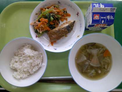 牛乳 麦ごはん 秋鮭のごまみそ焼き 小松菜のおひたし きりたんぽ汁 「旬」とは、野菜や果物、魚などが最もおいしく、栄養も豊富な時期のことです。秋に旬を迎える代表的な魚は、サンマ、サバ、鮭(アキサケ)、カツオ(戻りガツオ)です。これらの魚は産卵期を前に栄養を蓄え、脂がのって美味しくなるのが特徴です。10月の献立にも、秋に旬を迎える魚が登場します。楽しみにしていてください。 今日もおいしくいただきましょう! 今日の給食【9月25日】
