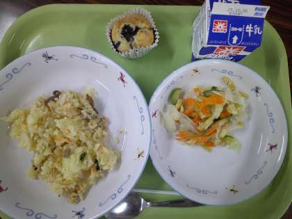 牛乳 チキンパエリア シーザー風サラダ ブルーベリーマフィン 今日は東京都産のブルーベリーを使って、ブルーベリーマフィンを作りました。ブルーベリーの生産日本一は東京都です。2015年に、1981年からずっと1位だった長野県を抜いて全国トップになりました。ブルーベリーの旬は6月から9月くらいです。練馬区内には、ブルーベリーが収穫できる観光農園がたくさんあります。給食室で手作りした、甘酸っぱいおいしさいっぱいのブルーベリーマフィンです。 今日もおいしくいただきましょう! 今日の給食【9月26日】