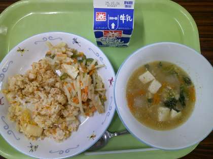 牛乳 キムチチャーハン じゃがいもの中華炒め 豆腐とはくさいのごまみそスープ 二学期が始まって暑さが厳しい中、運動会の練習が始まりましたね。毎日毎日、一生懸命に取り組んでいる姿はとてもまぶしく、みなさんの努力が実ると信じています。あさってから応援の気持ちを込めて、「運動会応援献立」を作ります。学年ごとのダンスのイメージや、使われている音楽からアイデアをもらいました。楽しみにしていてください。 今日もおいしくいただきましょう! 今日の給食【9月29日】