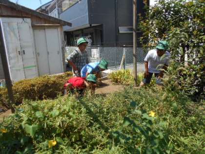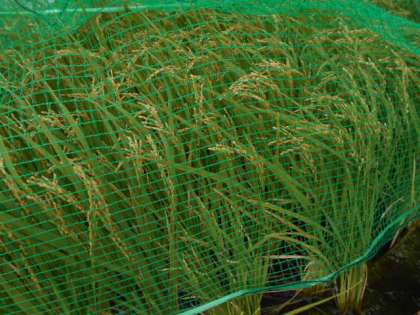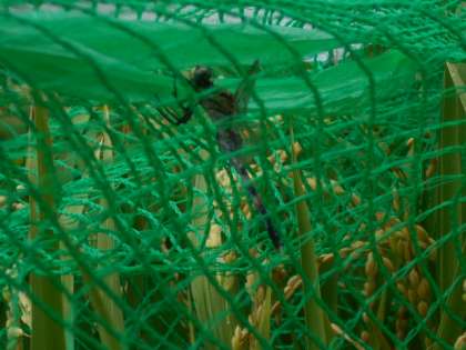 収穫できるのはいつでしょうか。 ネットの中に迷い込んだのはトンボ。 暑さが続く中でも、季節は確実に秋に向かっています。 ミッキー池の生き物救出作戦