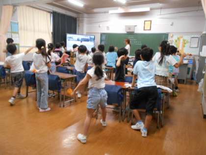 学校に隣接する大きな畑が大根畑です。 区内の他のいくつかの小学校も同じように種まきや収穫の体験をするそうです。 よく耕した土に穴の開いたビニールシートがはってあり、一つの穴に種を3粒ずつ植えていきました。 深く植えすぎないことが大切です。 芽が出て少し経ったら間引きをするトイことも教えていただき、それまでは吉田さんがお世話をしてくださいます。 いつもありがとうございます。 1年生 トウモロコシの収穫