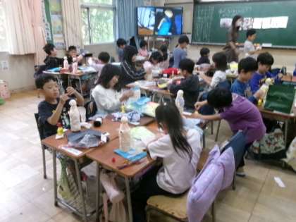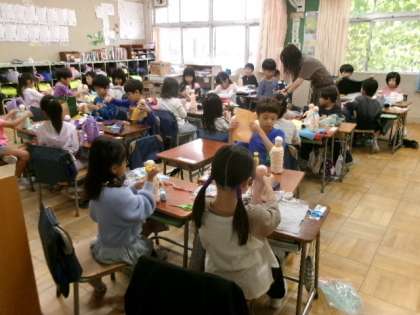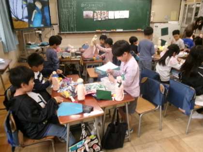 1年生の図工の時間には「ゆめのせかいへ」という単元で立体作品に取り組んでいます。パーティに来ていく洋服を考えて飾りつけているところです。