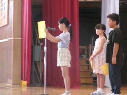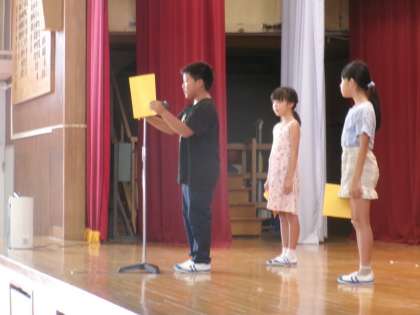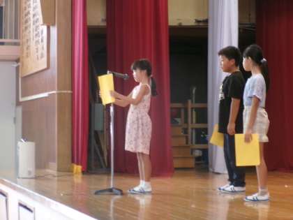 代表児童の言葉を、3年生の3人が発表してくれました。1学期にもっと頑張りたかったこと、2学期に頑張りたいこと、しっかり話せていましたね。
