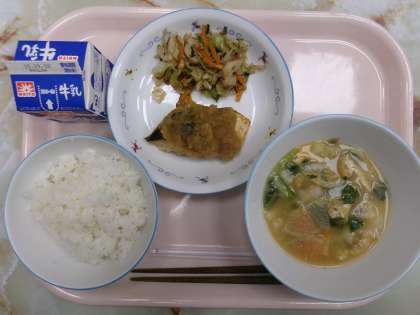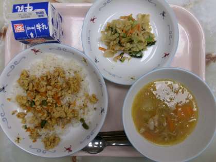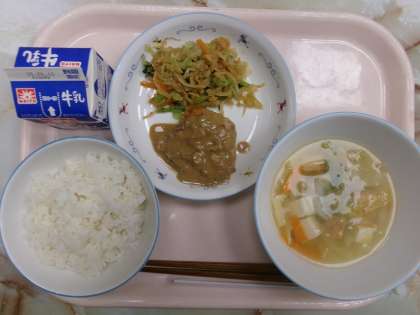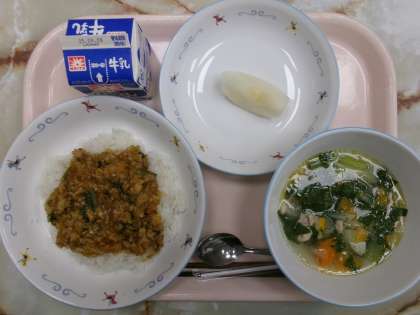 給食室のみなさんが、高野豆腐を細かくそぼろにしてくださいました。味もしみ込んでいて、ごはんがとても進みます。体を冷やしてくれる効果のある冬瓜を使った豚汁。名前の由来は「冬まで保存ができる」ことからきているそうです。今日も美味しく食べて、元気に過ごしましょう。