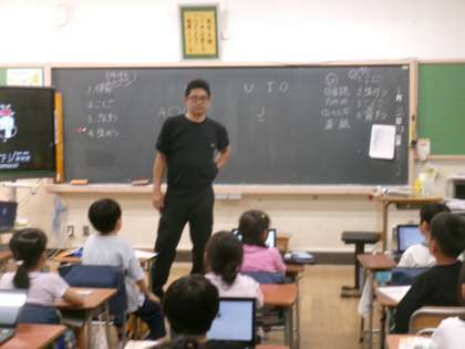タブレットにローマ字で入力する方法について教わっています。母音となる「aiueo」の場所と、文字を入力するときは「aiueo」と組み合わせるんだよと教わりました。