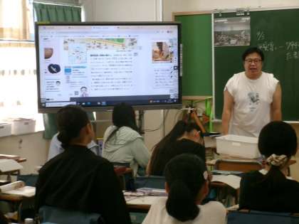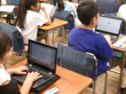 講師の先生をお招きして、夏休みプログラミング教室を開催しました。家庭科室と視聴覚室に分かれて、プログラミングアプリの「scratch」を使ってのアニメーション作りを行いました。