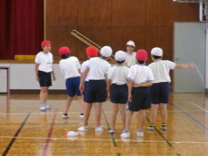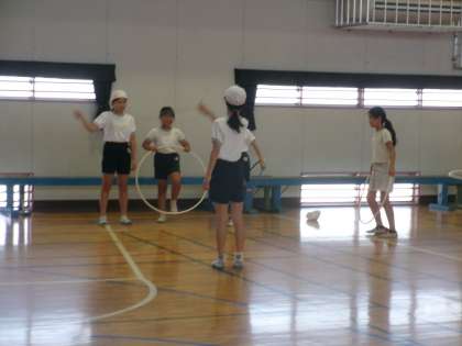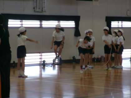 一つ動きが加わるだけで、上手に縄を跳ぶのが難しくなります。グループのみんなが跳びやすいように、どう工夫をすればよいかを相談している様子が見られました。
