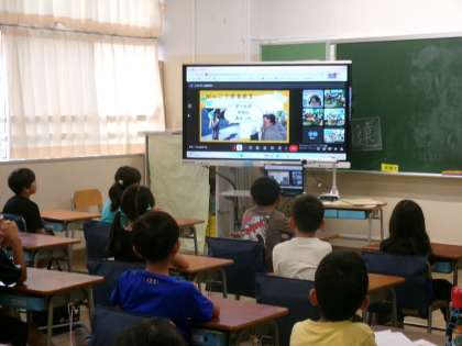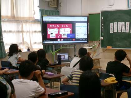 どのクラスも静かにモニターからの情報を見ています。学校の中で起きやすいけがについても、最初にどのように対処するのがよいか、クイズ形式のお話もありました。