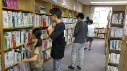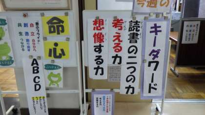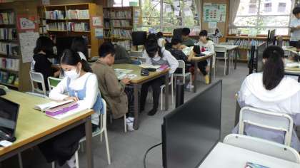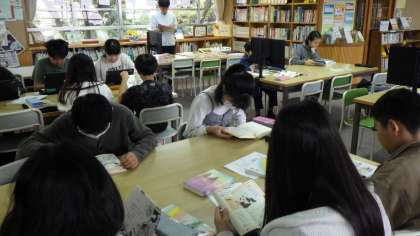 図書室を使用して学習していました。 高学年は、低学年のように時間割に「図書」の時間が設定されてはいませんが、国語科の学習の中で、「学校図書館などを利用し、複数の本や新聞などを活用して、調べたり考えたりしたことを報告する活動」が「読むこと」の内容に示されています。