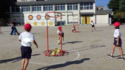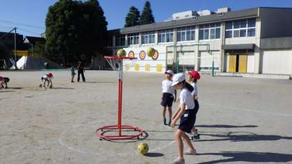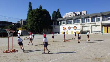 校庭では、3年生が「ゲーム」の学習に取り組んでいました。 さわやかな秋晴れのもと、気持ちの良い声の掛け合いや動きが見られました。