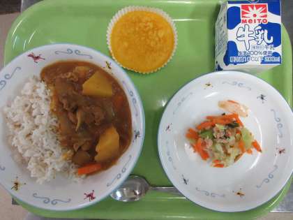 今日は、米粉を使ったコメッコカレーです。 通常のカレーは、油、小麦粉、カレー粉でルウを作りますが、今日は小麦粉を使わず米粉でルウを作りました。 米粉は、小麦粉より消化がゆっくりで腹持ちがよいので食べ過ぎを防ぐことができます。 デザートに、にんじんが入ったキャロットカップケーキもいただきました。