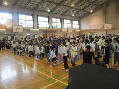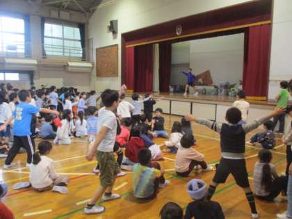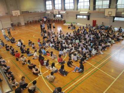 朝から小雨が降っていたので、体育朝会を体育館で行いました。舞台に立った運動委員会の児童対全校児童で、身体全体を使ってじゃんけんをしました。
