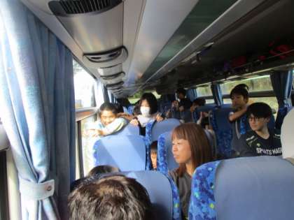 バスレクで係の子が先生クイズをしてくれました。上里SAでトイレ休憩をし、再出発しました。