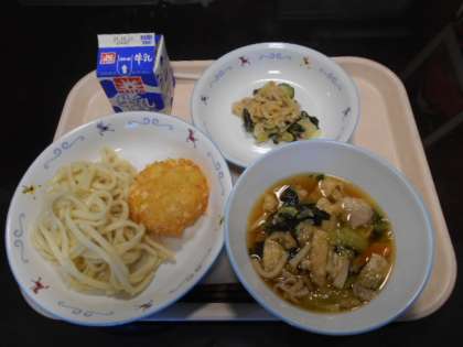 きつねうどん、もちもちチーズポテト、和風ツナサラダトマトドレッシング、牛乳