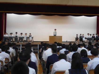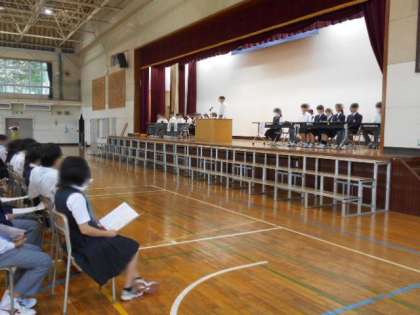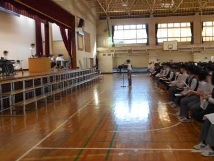 今年度2度目の生徒総会です。いよいよ専門委員会は後期になり、中心も3年生から2年生になりました。生徒会、学級委員会、美化委員会、体育委員会、保健委員会、放送委員会、給食委員会、図書委員会、18人の委員長に認証証を手渡しました。生徒の皆さんによって選ばれた、それぞれの分野の代表です。これからの半年間、よろしくお願いします。