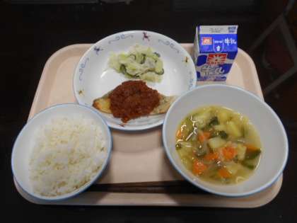 ご飯、魚のフライマリアナソースがけ、しらす入りコールスローサラダ、じゃがいもとレンズ豆のスープ、牛乳