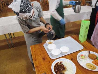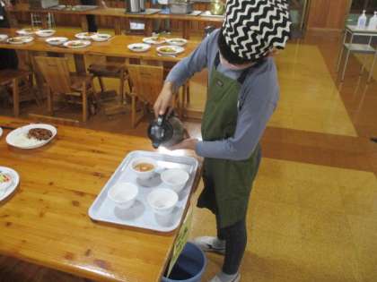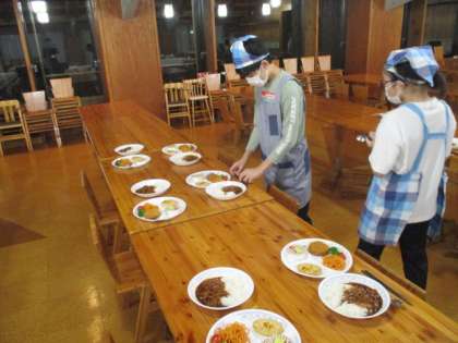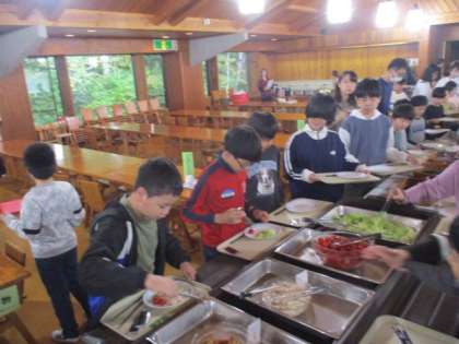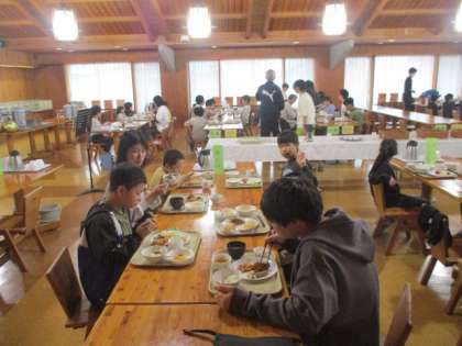 1日目の夕食の準備を高学年で行いました。箸やスプーンの置き方の向きを意識したり、お茶を人数分配ったりすることなど、さすが高学年、てきぱきと行動してくれました。お蔭でスムーズに準備を終えることができました。