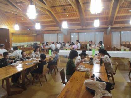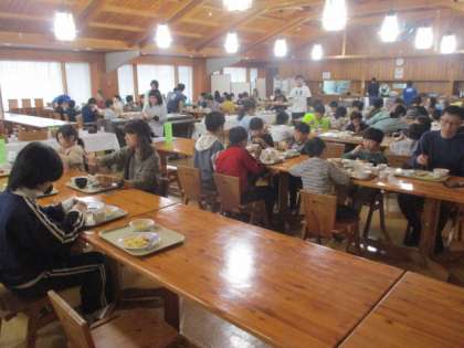 1日目の夕食の時間になりました。4校が一堂に会し、合同開校式を行ってからいただきますをしました。しっかり体を動かした今日、どの子もしっかりと夕食を食べていました。
